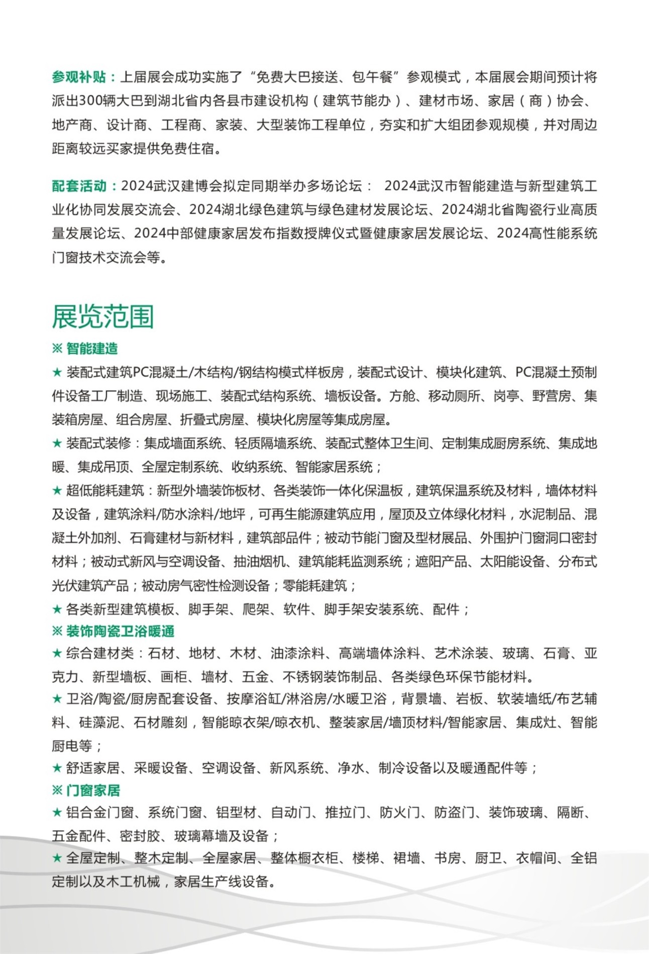 2024武汉市智能建造与新型建筑工业化协同发展交流会、2024湖北绿色建筑与绿色建材发展论坛、2024湖北省陶瓷行业高质量发展论坛、2024中部健康家居发布指数授牌仪式暨健康家居发展论坛、2024高性能系统门窗技术交流会等。