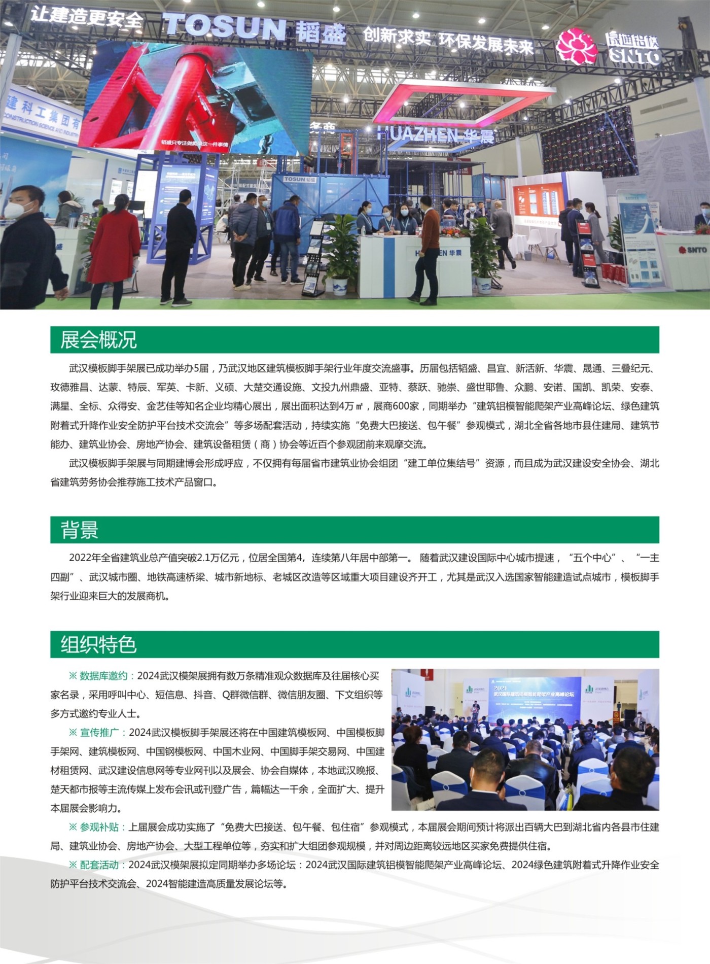 武汉模板脚手架展与同期建博会形成呼应,不仅拥有每届省市建筑业协会组团“建工单位集结号”资源,而且成为武汉建设安全协会、湖北省建筑劳务协会推荐施工技术产品窗口。