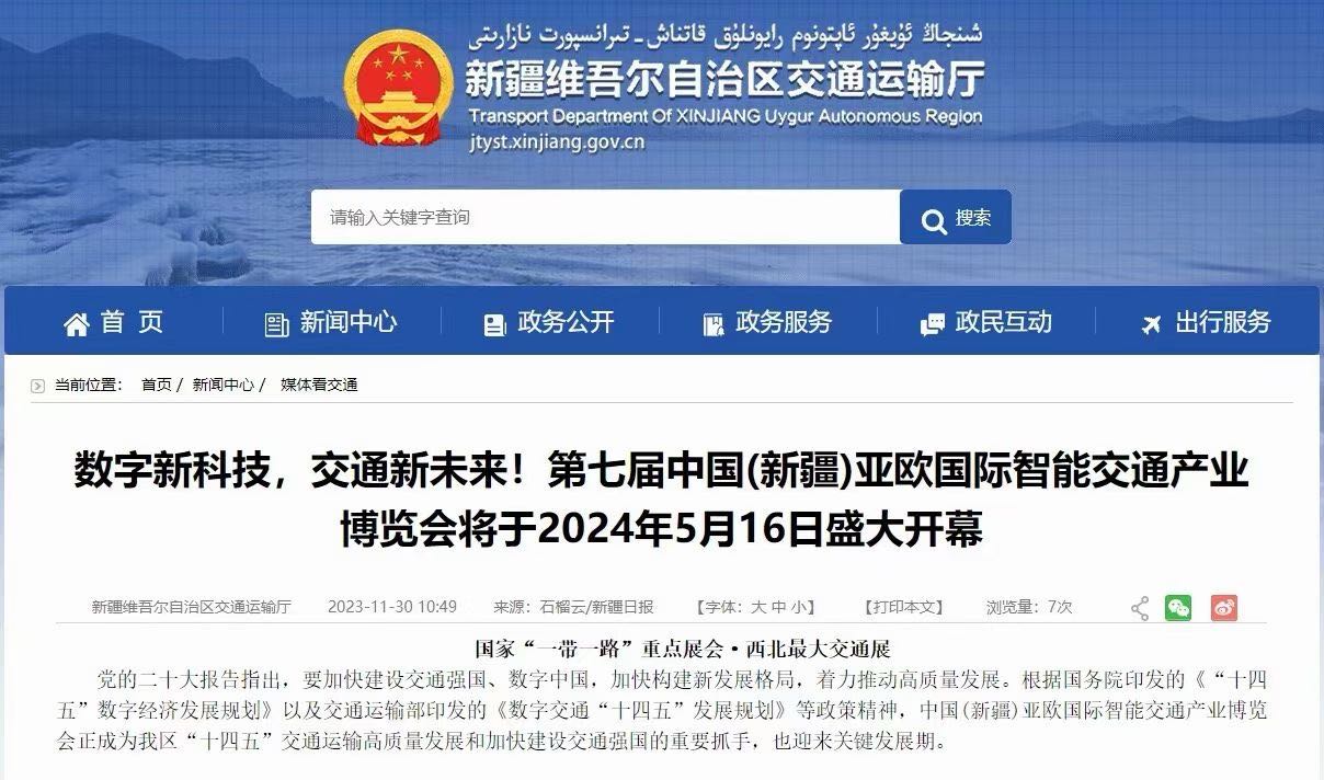 新疆交通会 | 第七届中国(新疆)亚欧国际智能交通产业博览会&第七届中国(新疆)亚欧国际交通设施与工程博览会暨丝路智能交通产业高质量发展大会于2024年5月16-18日在新疆国际会展中心隆重举办,展会规模3万平米,国内外知名参展商500余家,如湖北交投、山东高速、贵州路桥、湖北路桥、博研智通、深圳励研、霸州瑞航、山东铭牌精工、西安三沃、齐普光电等国内外交通领域知名企业集中亮相展示,欢迎来新疆!
